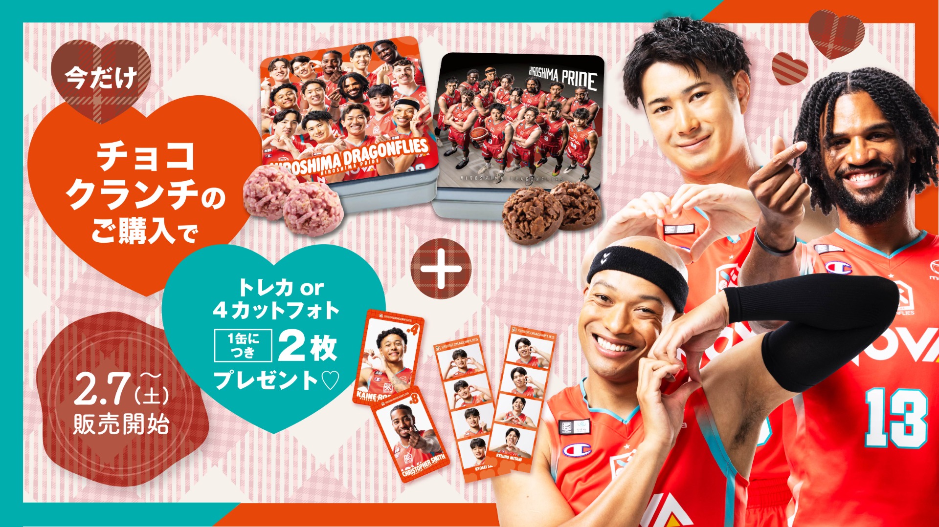 新商品のチョコクランチ缶をご購入のお客様全員に、選手ハートポーズトレカ or 4カットフォト2枚をプレゼントいたします!選手の個性あふれるハートポーズをご堪能ください❤